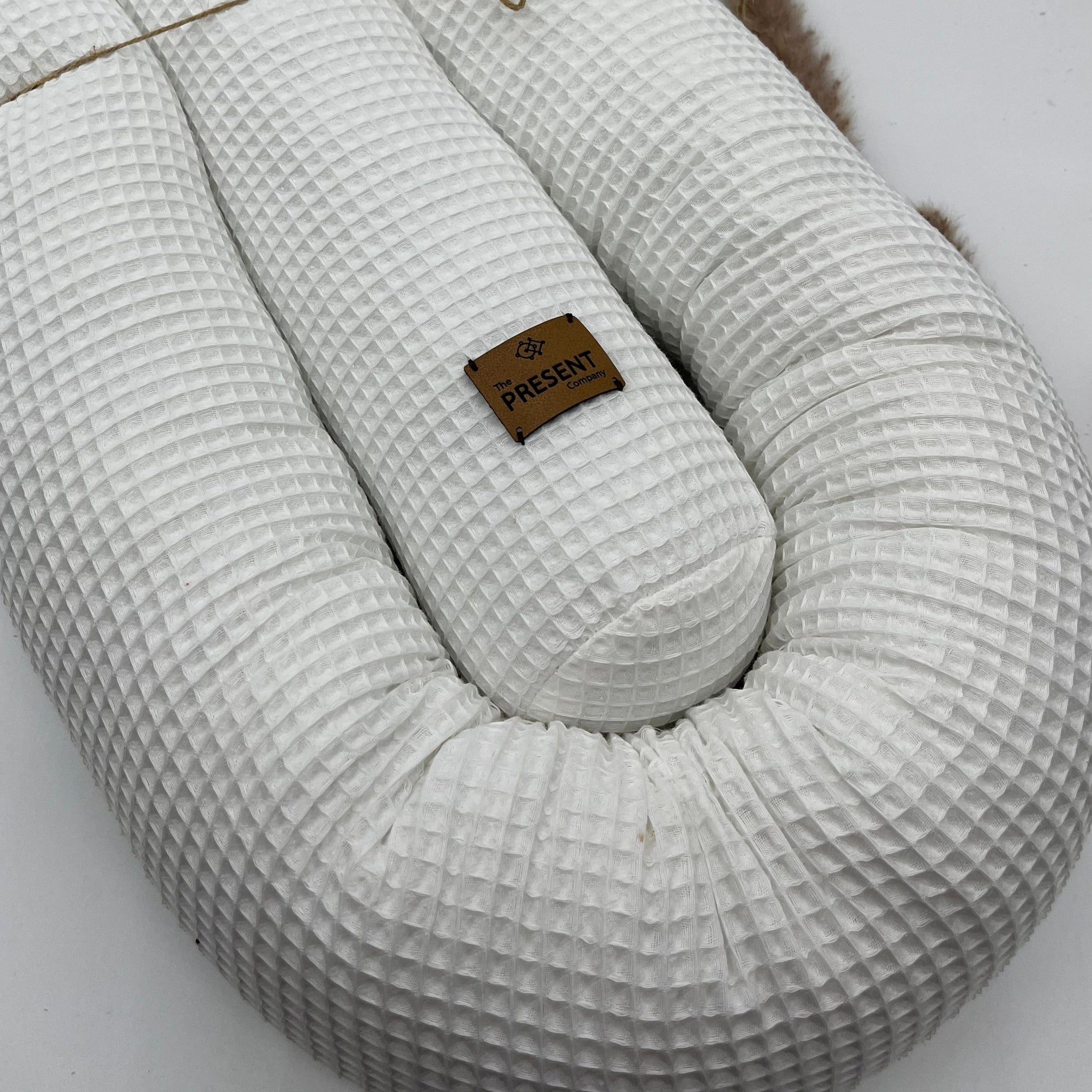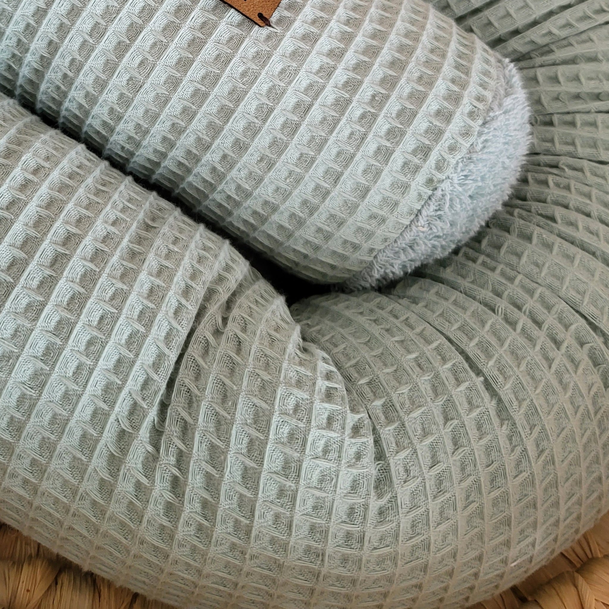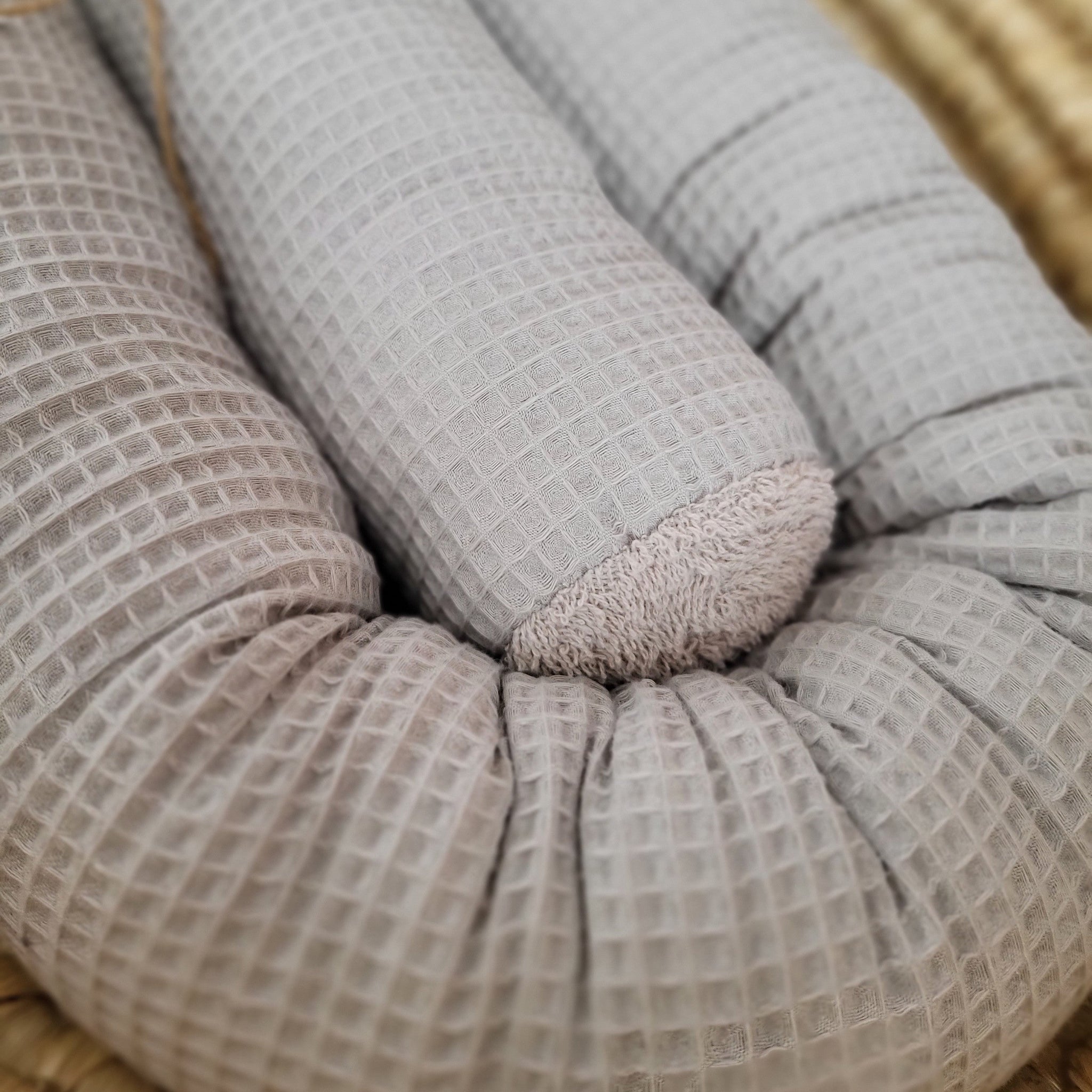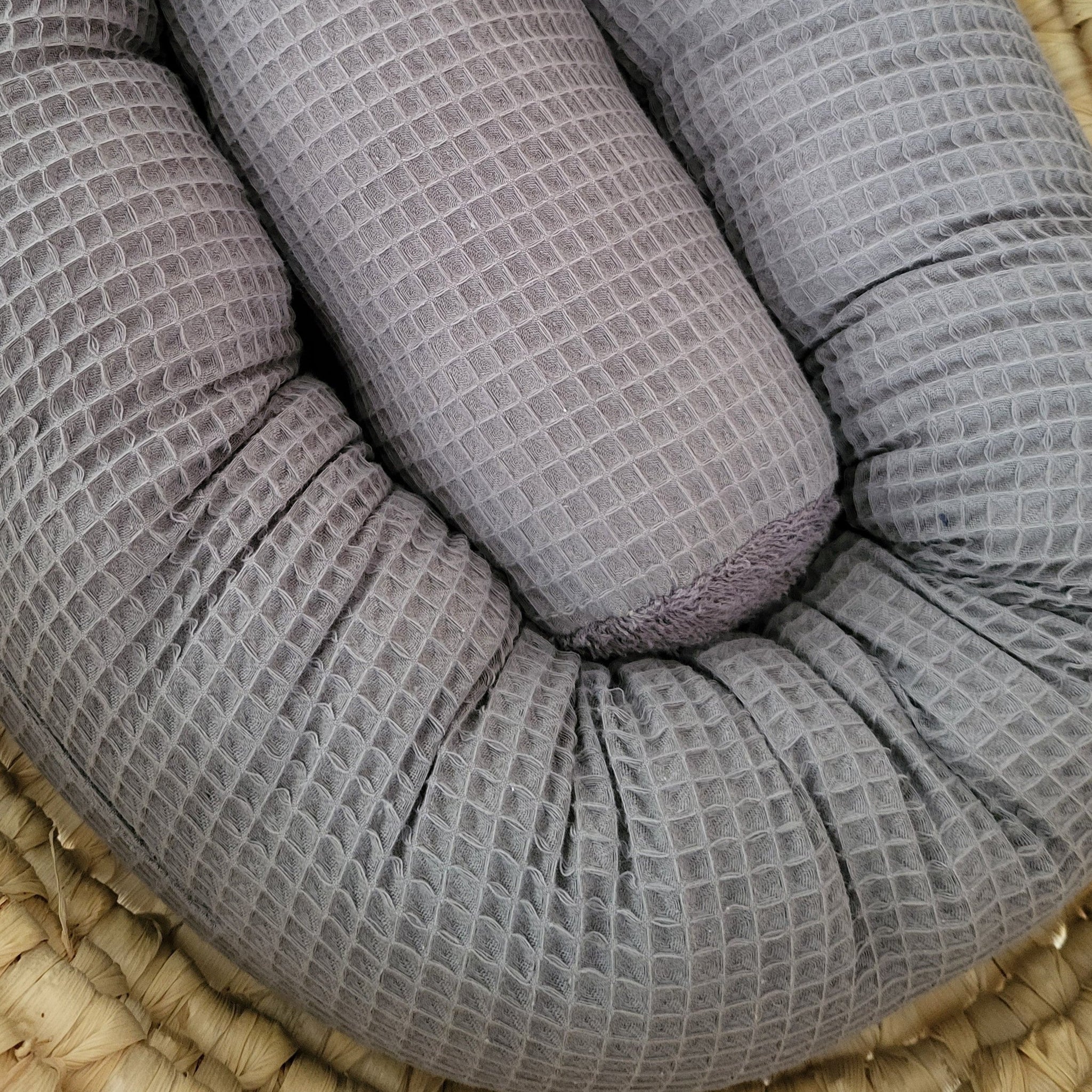 Unsere Bettschlange ist weich, kuschelig und ideal als Begrenzung im Babybett, Beistellbett oder auf der Wickelkommode. Die Enden von der Bettschnecke kannst du die selbst aussuchen, ob sie aus Frottee oder aus dem selben Stoff Waffelpique sein sollen.