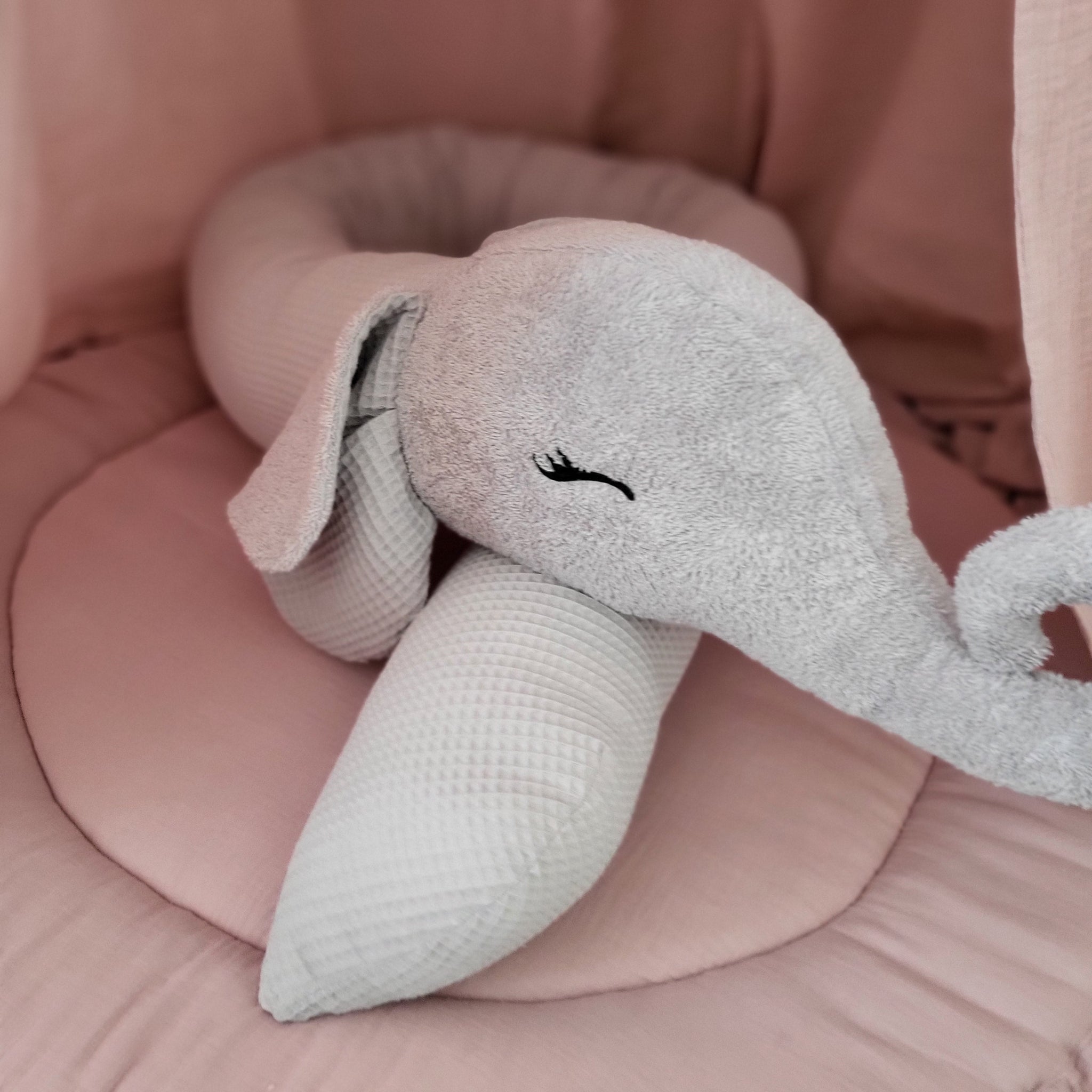 Ob als Nestchen, Randschutz oder zum Kuscheln – die Elefanten-Bettschlange sorgt für Geborgenheit und verhindert, dass sich dein Baby an den Gitterstäben stößt oder darin hängen bleibt.