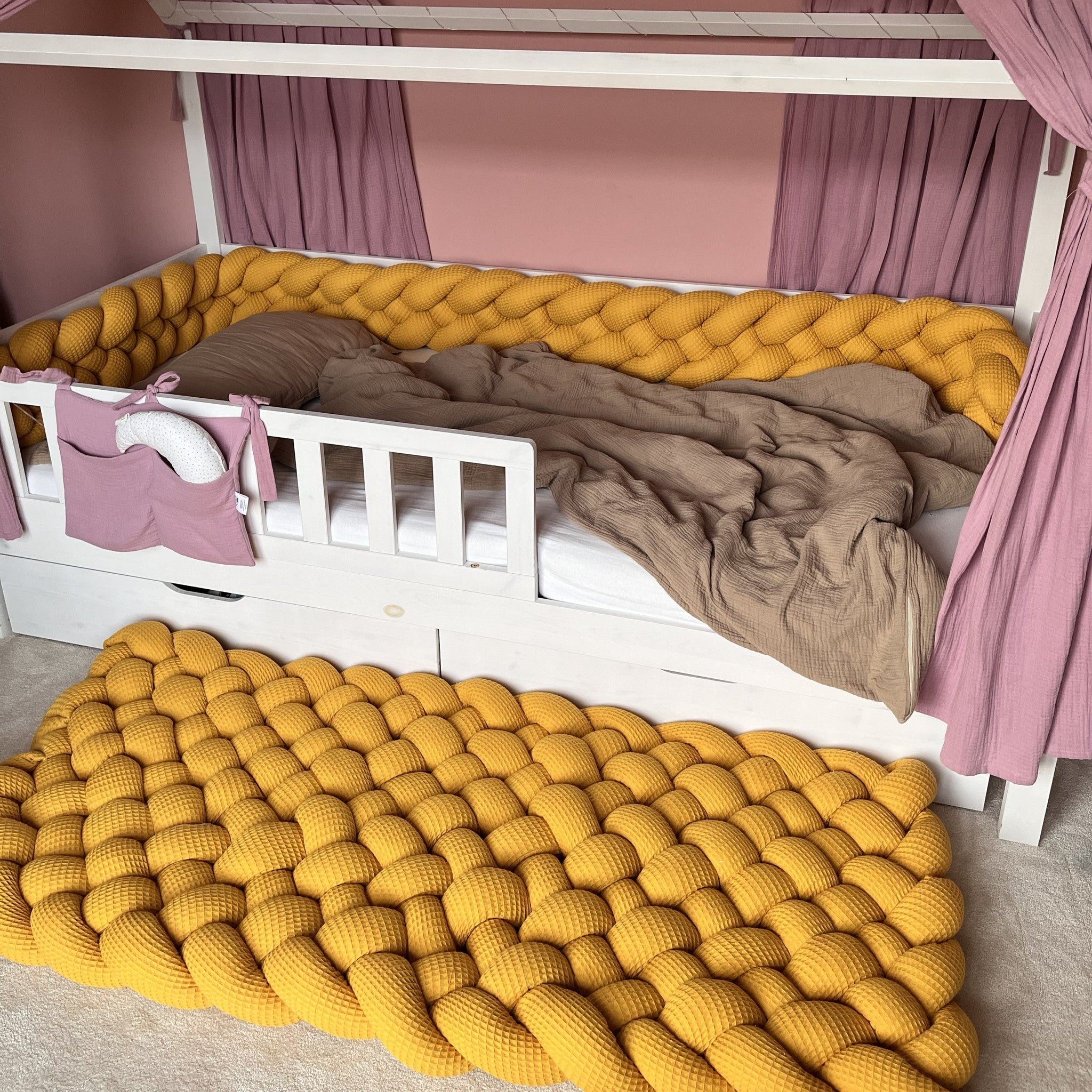 Jedes Stück wird in liebevoller Handarbeit in unserem Atelier in Unterfranken gefertigt. Das weiche, voluminöse Flechtdesign sorgt für ein unvergleichlich angenehmes Laufgefühl und ist zugleich ein echter Blickfang. Der Teppich eignet sich ideal vor dem Kinderbett, im Spielbereich oder als dekoratives Element im Familienraum.