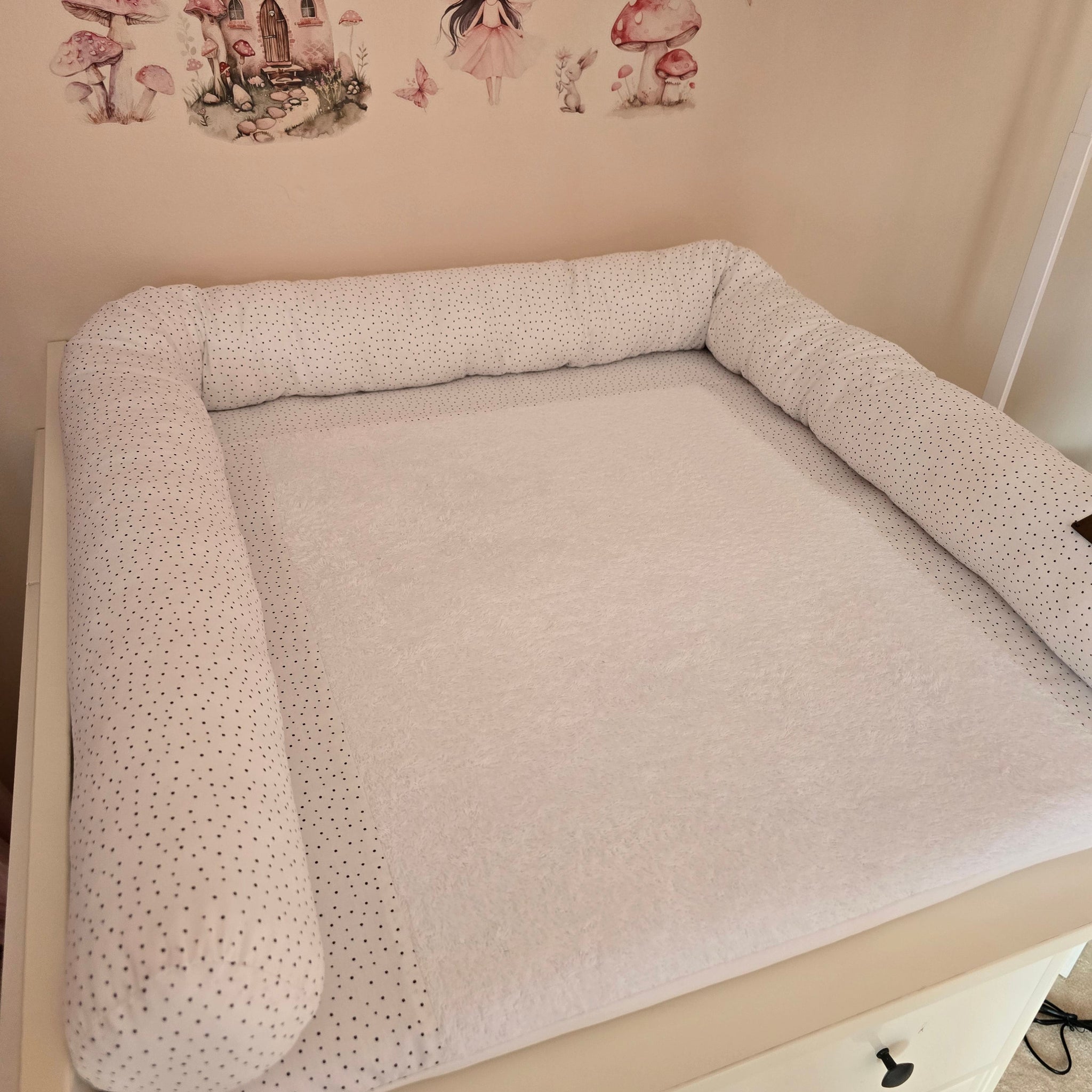 Beim Wickeln kann es turbulent werden – gut, wenn dein Baby dabei sicher gebettet ist. Unsere Wickeltischumrandung sorgt für eine weiche Begrenzung rund um die Wickelauflage und verhindert, dass sich dein Baby versehentlich wegrollt oder stößt.